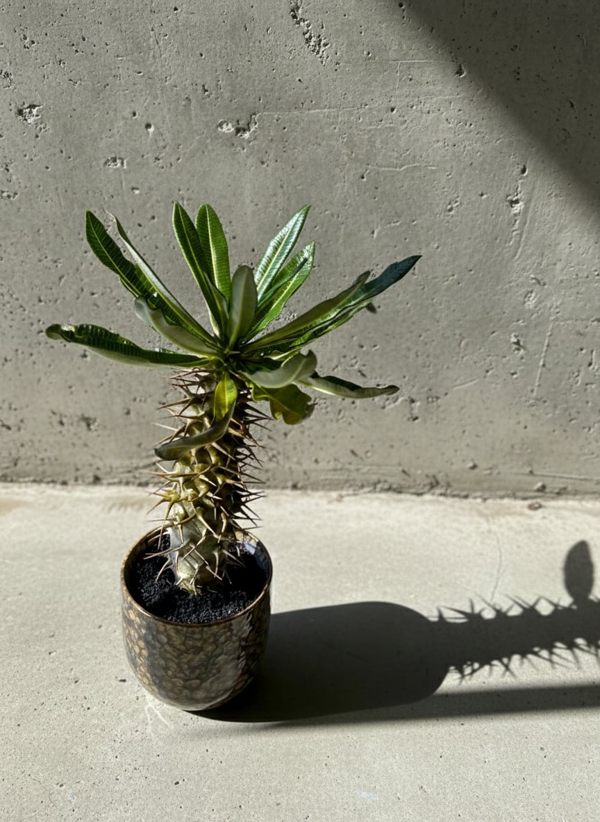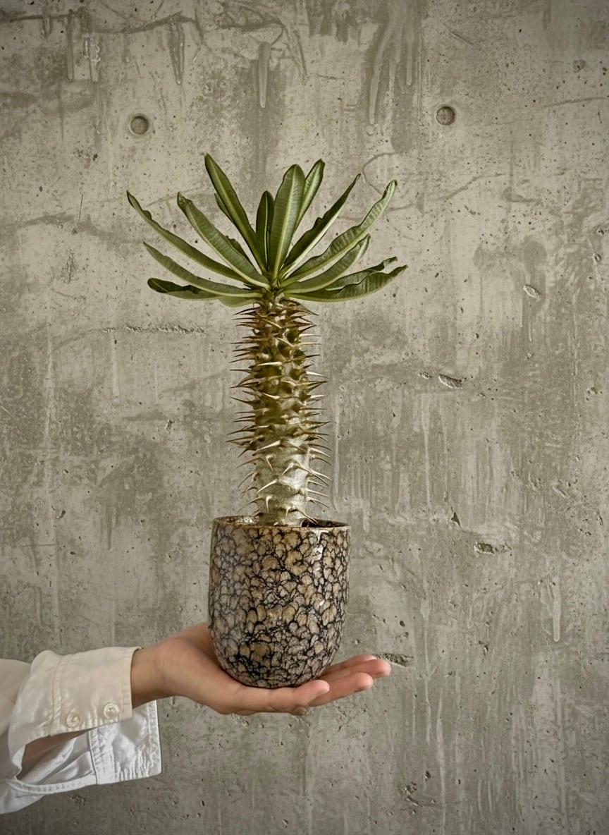 パキポディウム・アンボンゲンセは、エキゾチックな魅力を持つ多肉植物です。特徴的なトゲと美しい葉のフォルムが、インドアスペースに個性的なアクセントを加えます。この植物は乾燥に強く、手間がかからないため、忙しい方にもお勧めです。日光を浴びることで美しい成長を促し、インテリアに自然の息吹を添えてくれます。